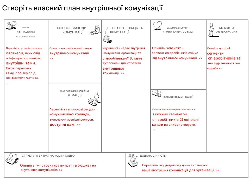 Канва моделі HR- комунікації (HR CMC), грунтована на канві бізнес-моделі Алекса Остервальдера, була скоректована відповідно до по внутрішніх комунікаціях.