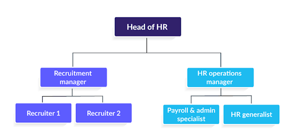 У наведеному прикладі структури керівник HR відділу очолює менеджера з підбору персоналу, який відповідає за залучення талантів, та операційного менеджера, який бере на себе багато обов'язків, пов'язаних із розрахунком заробітної плати, HRIS та самообслуговуванням. Адміністративні співробітники перебувають у операційному відділі. У міру зростання організації вони можуть додавати додаткові функціональні групи, такі як управління талантами, навчання та розвиток, компенсація, HR-аналітик тощо.