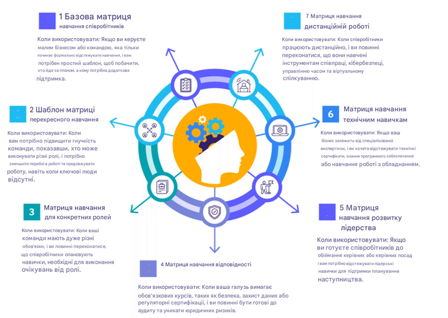 - Матриця навчання на основі проектів: Використовується в проектних командах для забезпечення правильного поєднання навичок для конкретного проекту. До них можуть належати гнучке навчання, сертифікати з управління проектами або спеціалізованим інструментам.