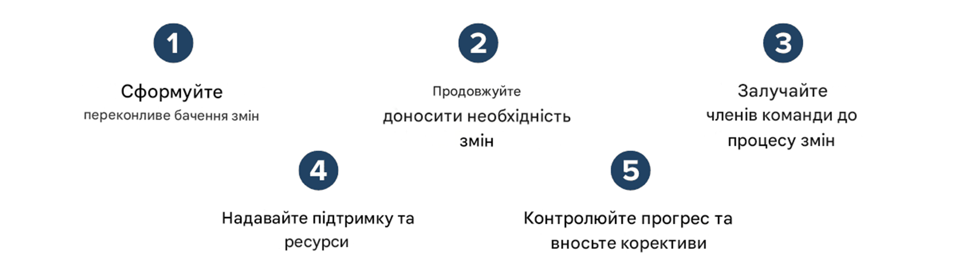 Сформулюйте чітке і переконливе бачення майбутніх змін. Опишіть бажаний майбутній стан, переваги змін і те, як цей зсув узгоджується з цілями і завданнями команди. Обмін баченням допомагає їм зрозуміти свою роль, звикнути до змін і підготуватися до того, щоб внести свій вклад.